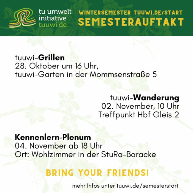 Für den Start ins WiSe 25/26 haben wir uns wieder ein spannendes und vielfältiges Programm für euch ausgedacht. Hier wird nicht nur was für Erstsemester zu entdecken sein, sondern auch für Studis, die z.B. neue Leute auf dem Campus kennenlernen wollen oder sich aktiv für die Nachhaltigkeit engagieren wollen. Kommt gerne vorbei!