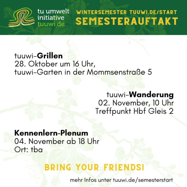 Für den Start ins WiSe 25/26 haben wir uns wieder ein spannendes und vielfältiges Programm für euch ausgedacht. Hier wird nicht nur was für Erstsemester zu entdecken sein, sondern auch für Studis, die z.B. neue Leute auf dem Campus kennenlernen wollen oder sich aktiv für die Nachhaltigkeit engagieren wollen. Kommt gerne vorbei!